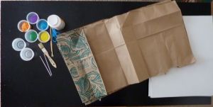 My works are mixed technique  – usually I use acrylic paints on brown paper (I find Whole Foods grocery bags are the best!), then cut and shape the work before applying it to the canvas with glue and sealer.