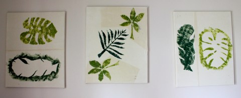 Printed Leaves (2011) each 16″x20″ Acrylic paint and glue on fabric and canvas
